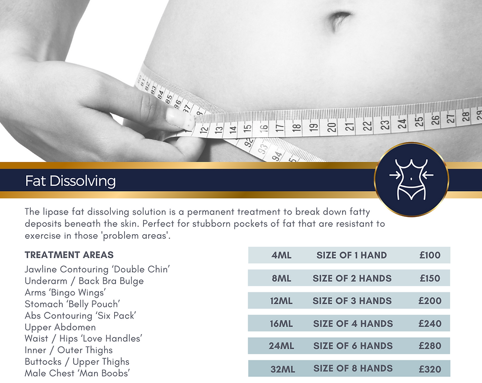 The lipase fat dissolving solution is a permanent treatment to break down fatty deposits beneath the skin. Perfect for stubborn pockets of fat that are resistant to exercise in those 'problem areas'.